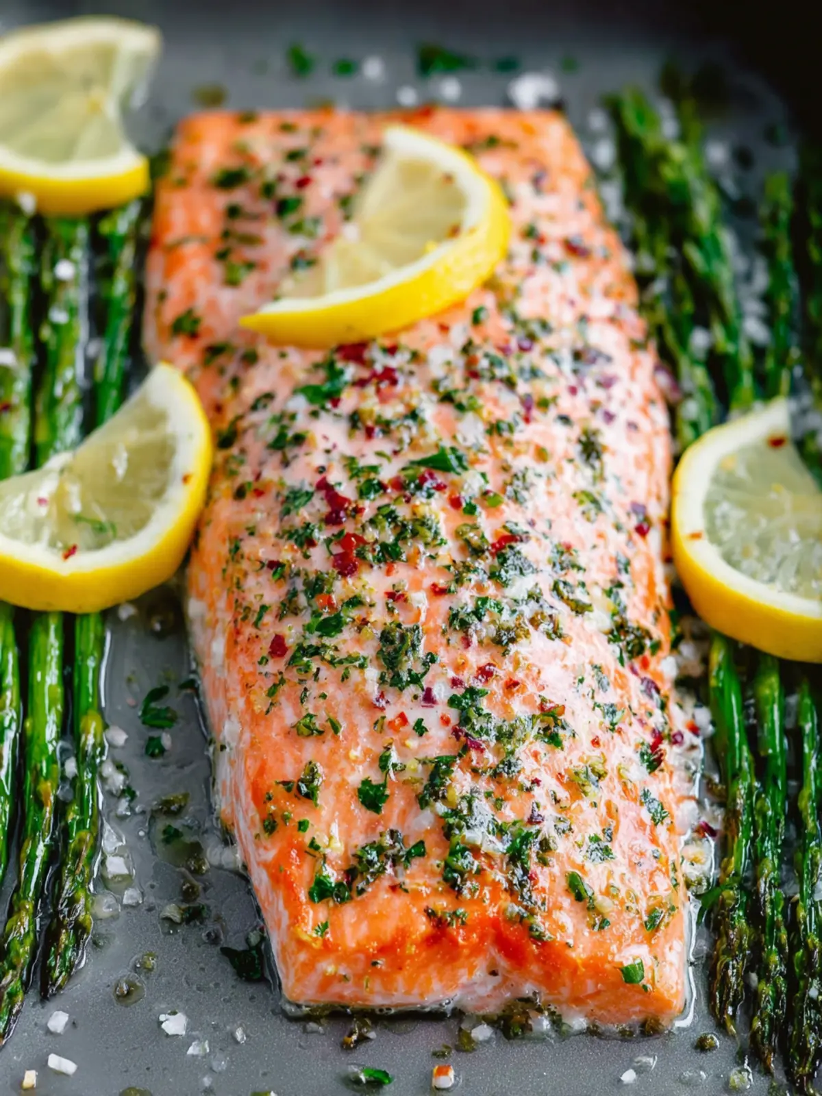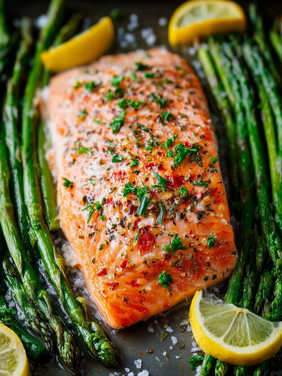 - Slice the lemon into wheels and place them on top of the asparagus (but not the salmon). Squeeze juice from the two ends of the lemon onto the tray. Then add the chopped fresh herbs on top of everything.