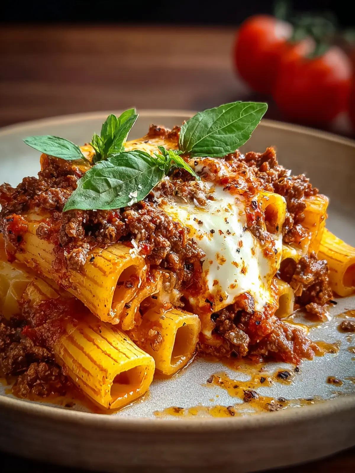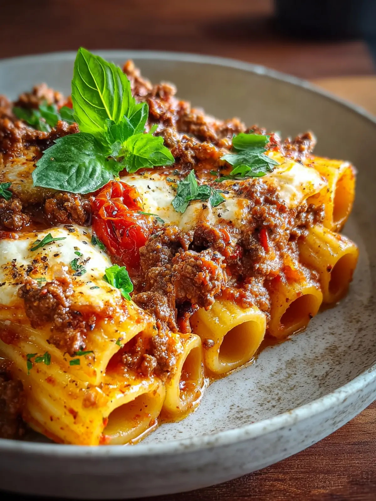 A delicious and hearty dish of rigatoni pasta stuffed with a flavorful beef ragu, topped with melted mozzarella and Parmesan cheeses, perfect for a comforting dinner.