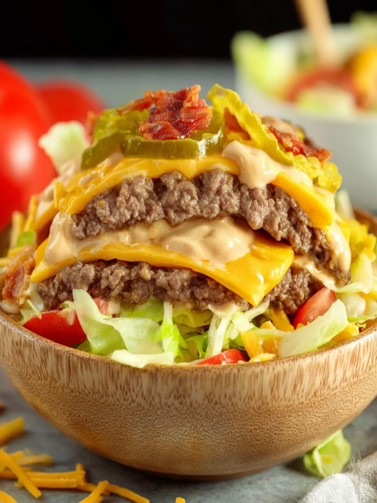 A delicious salad inspired by the classic Big Mac, featuring layers of fresh ingredients and a homemade sauce.