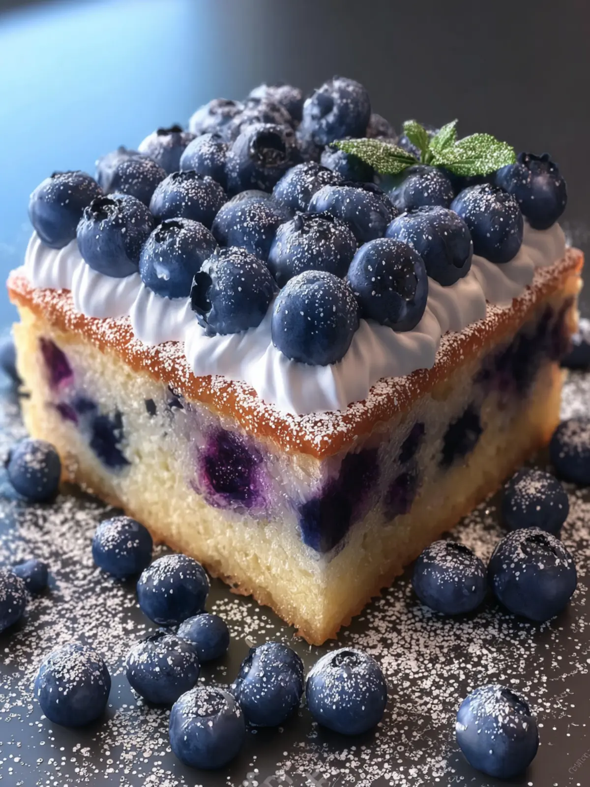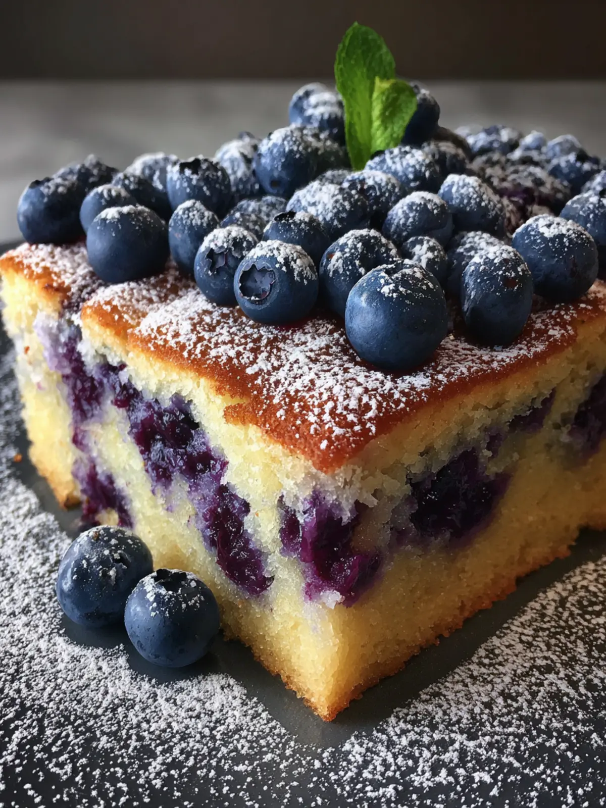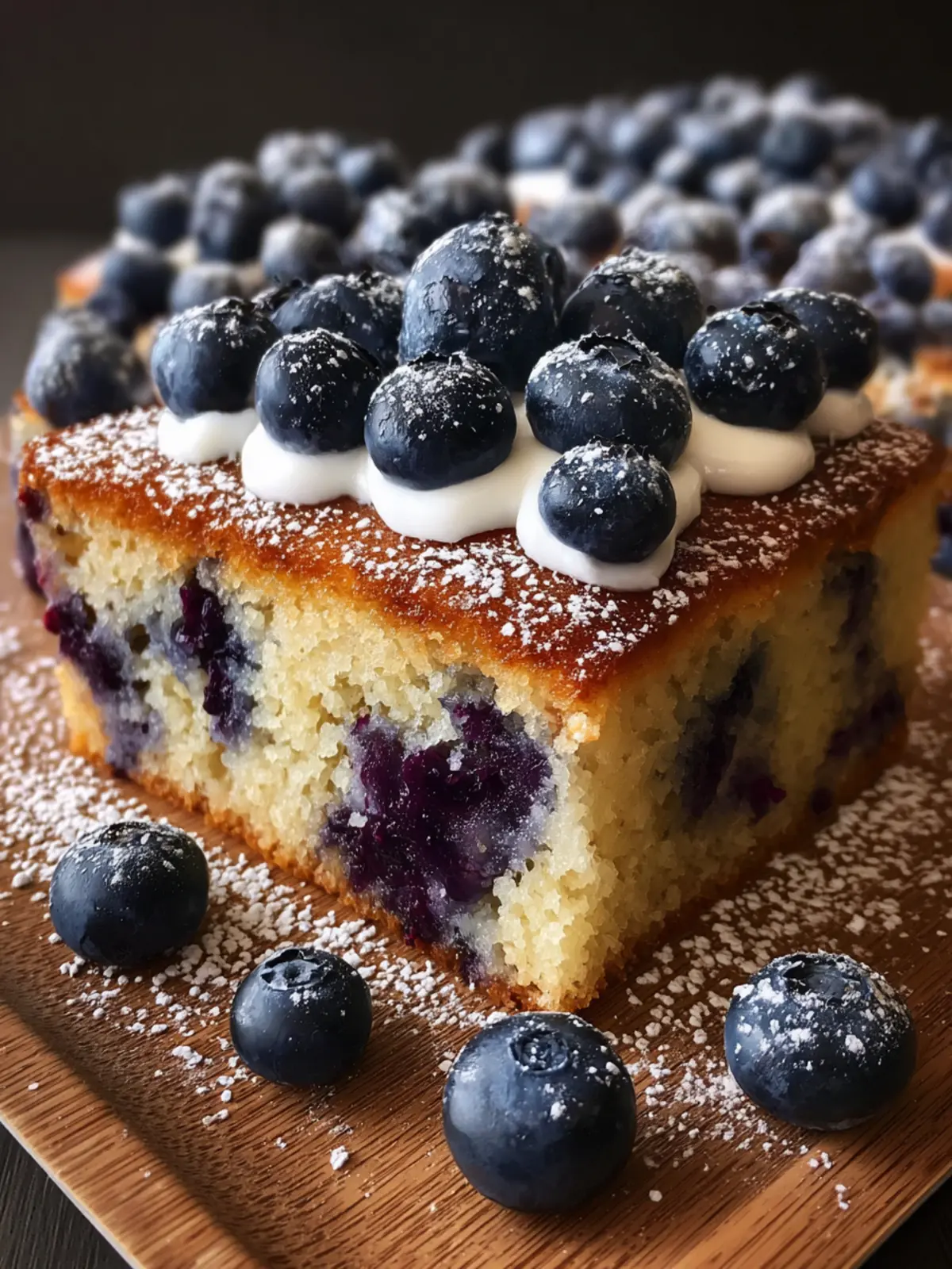 - Once cooled, you can dust the top with powdered sugar if desired. Cut the cake into squares and serve on a simple white plate, garnished with additional fresh blueberries for a beautiful presentation.