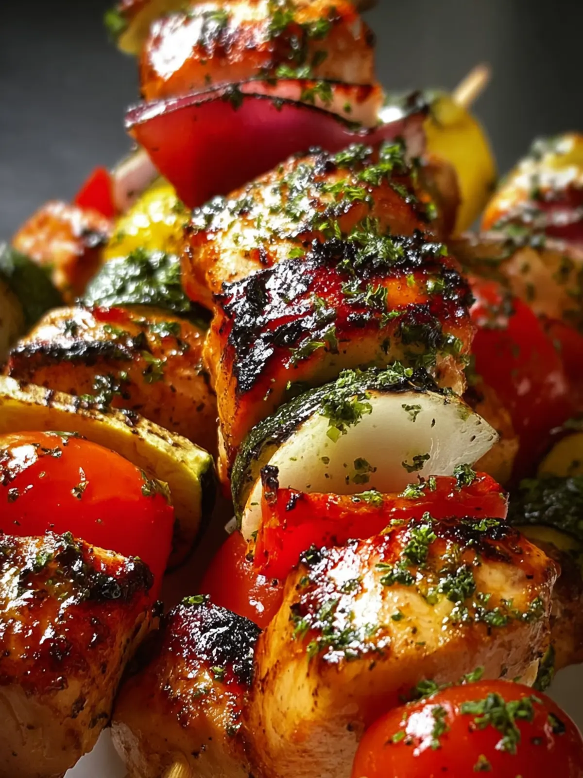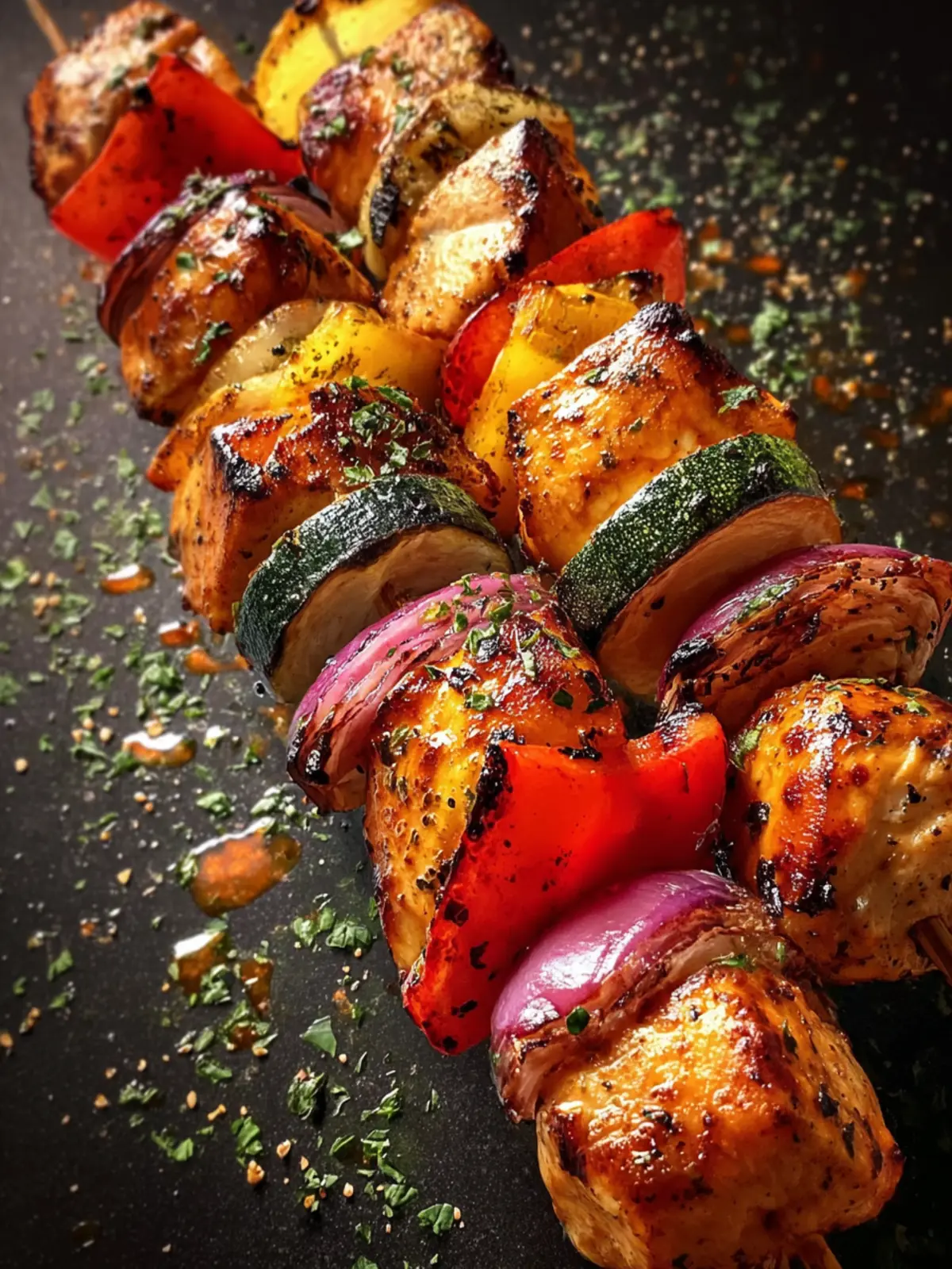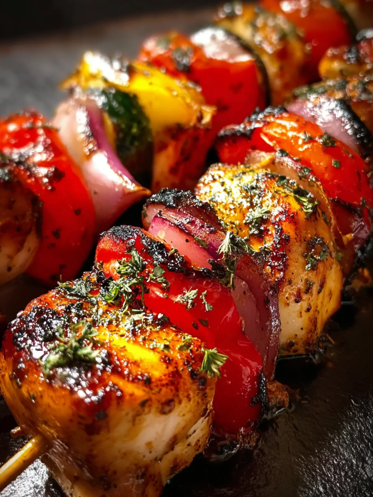 Delicious grilled chicken and veggies on skewers, perfect for a summer barbecues.