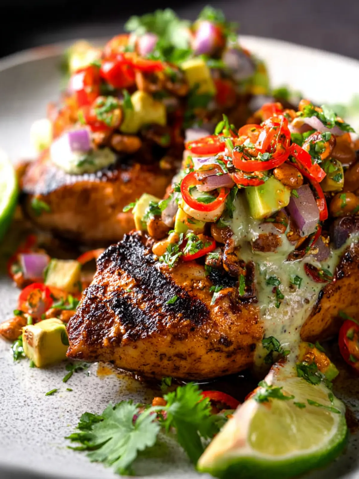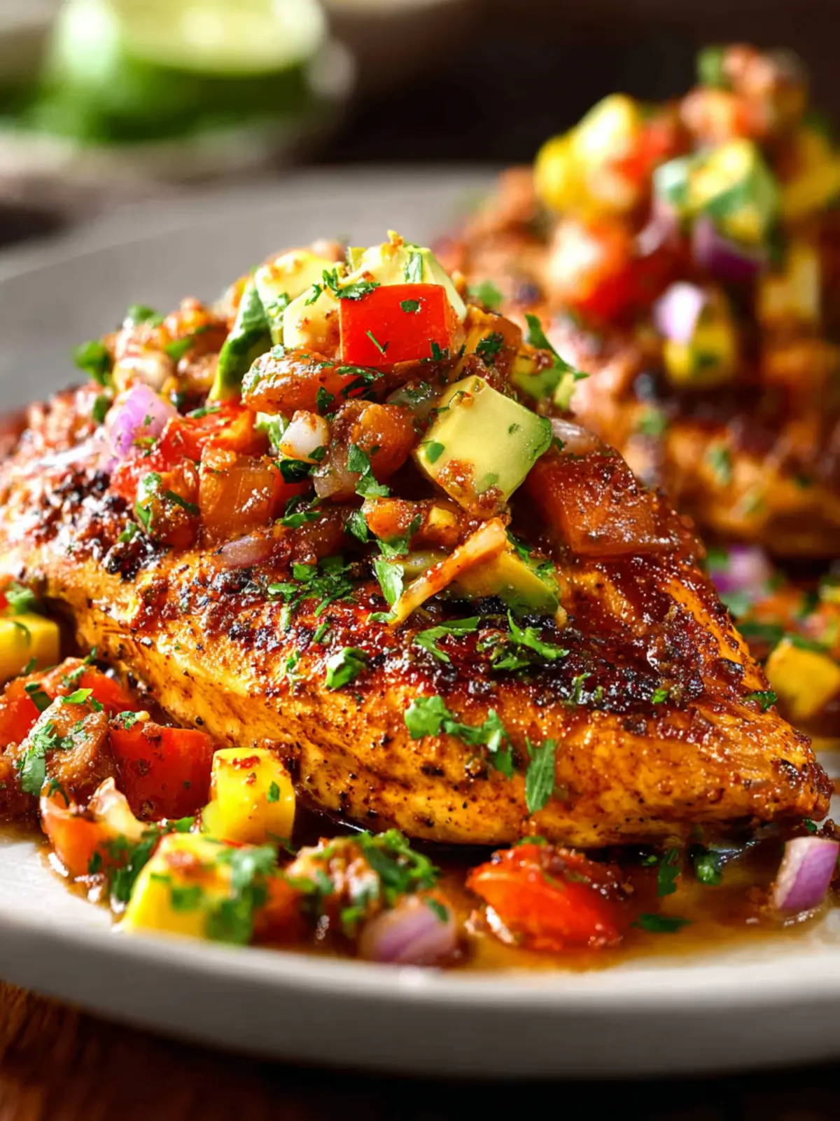 A flavorful grilled chicken dish topped with fresh avocado salsa, perfect for any occasion.