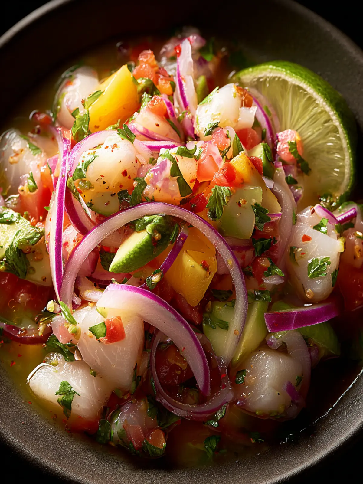 A refreshing ceviche made with fresh sushi-grade fish and vibrant vegetables.