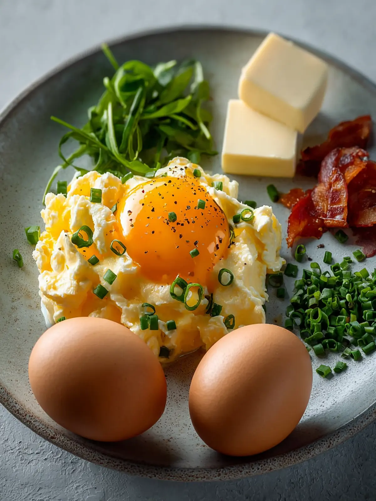 Chives: Finely sliced chives bring an aromatic freshness that complements the richness of the eggs. Their mild onion flavor adds a delightful contrast, making each bite a bit more exciting.