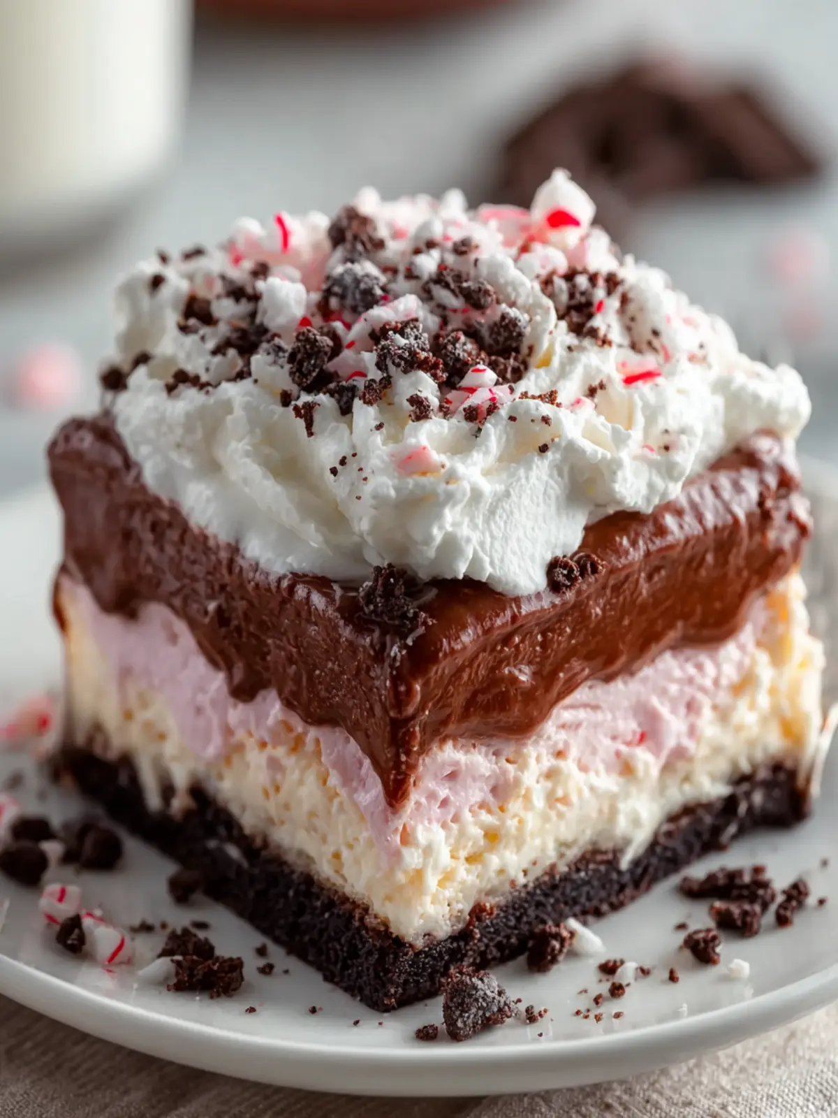 - Layered Goodness: The alternating layers of chocolate cream, whipped topping, and crushed peppermint provide a delightful texture. Each forkful is a medley of creamy, crunchy, and refreshing elements.