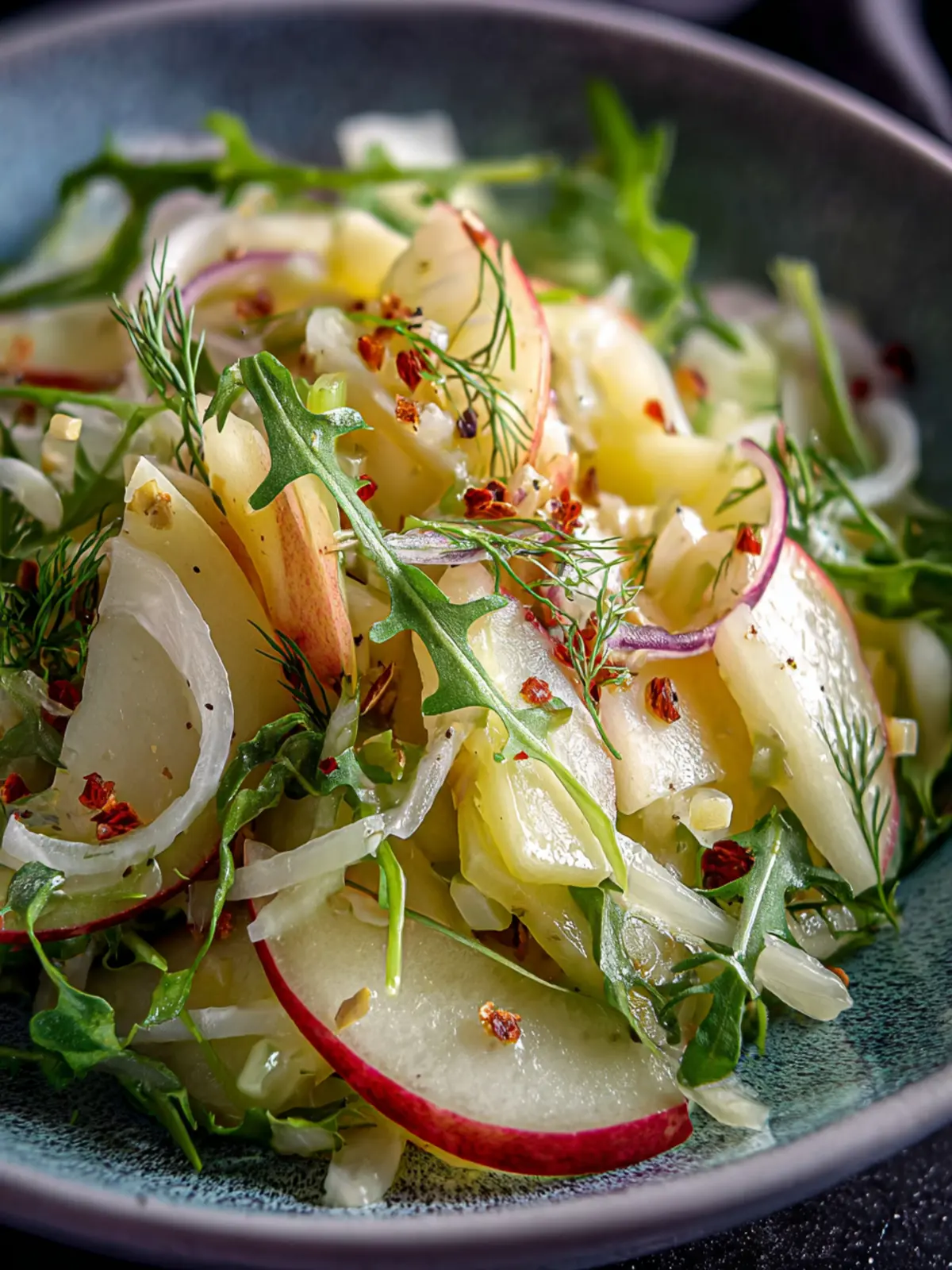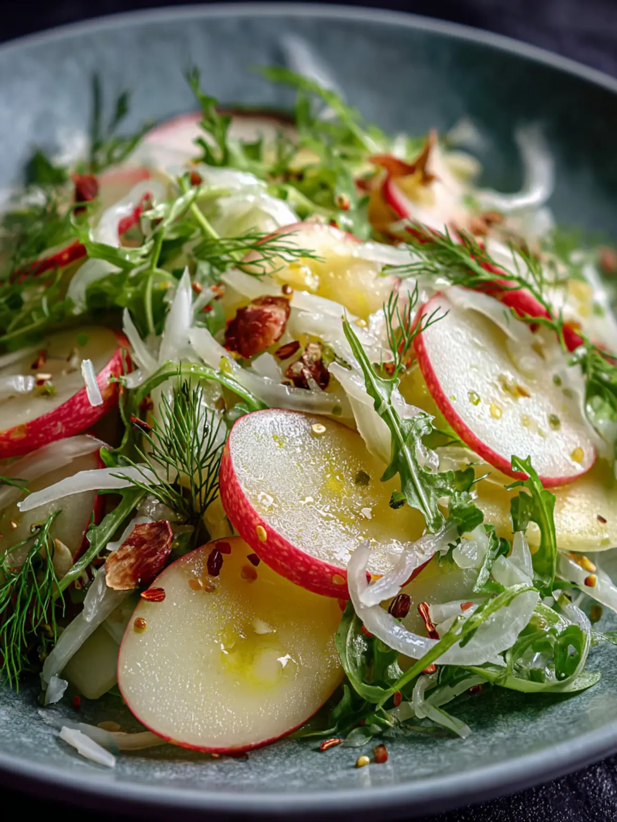 A refreshing salad combining crunchy apples and fennel, drizzled with a zesty dressing.