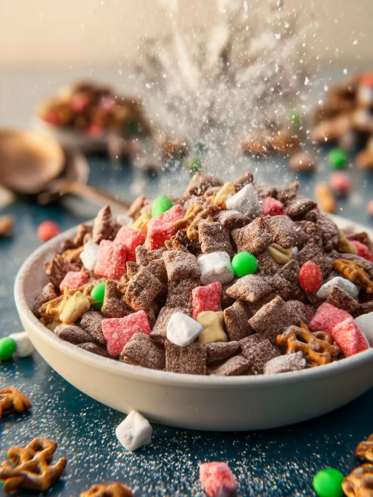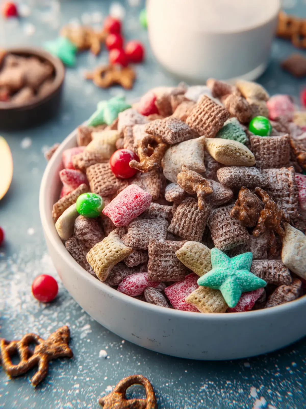 • Powdered Sugar: A sprinkle of powdered sugar at the end gives Reindeer Chow its signature sweetness and finishes it off beautifully with a snowy appearance.